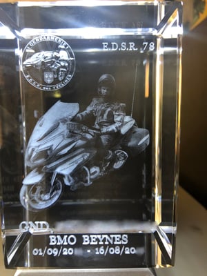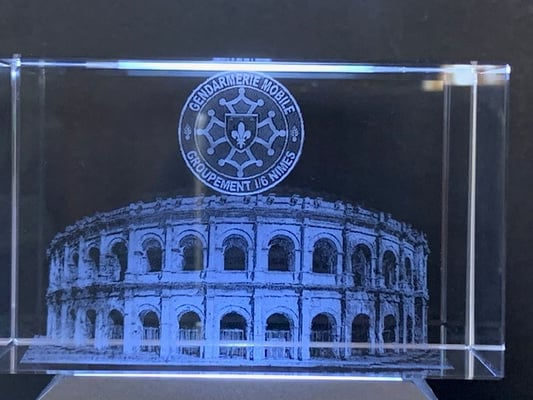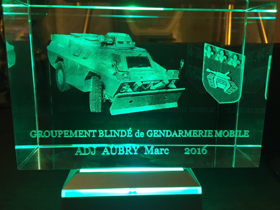 Nous utilisons la technologie laser et des logiciels de conversion en 2D ou 3D pour votre gravure sur verre pour gendarme.